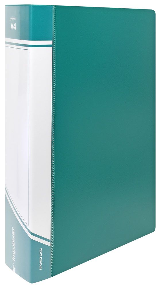 Прочная папка формата A4 из высококачественного пластика с прозрачными карманами-файлами. Внутренние файлы плотно закреплены в корешке папки. Имеет прозрачный карман с вкладышем для маркировки. Толщина пластика — 800 мкм, 100 файлов.