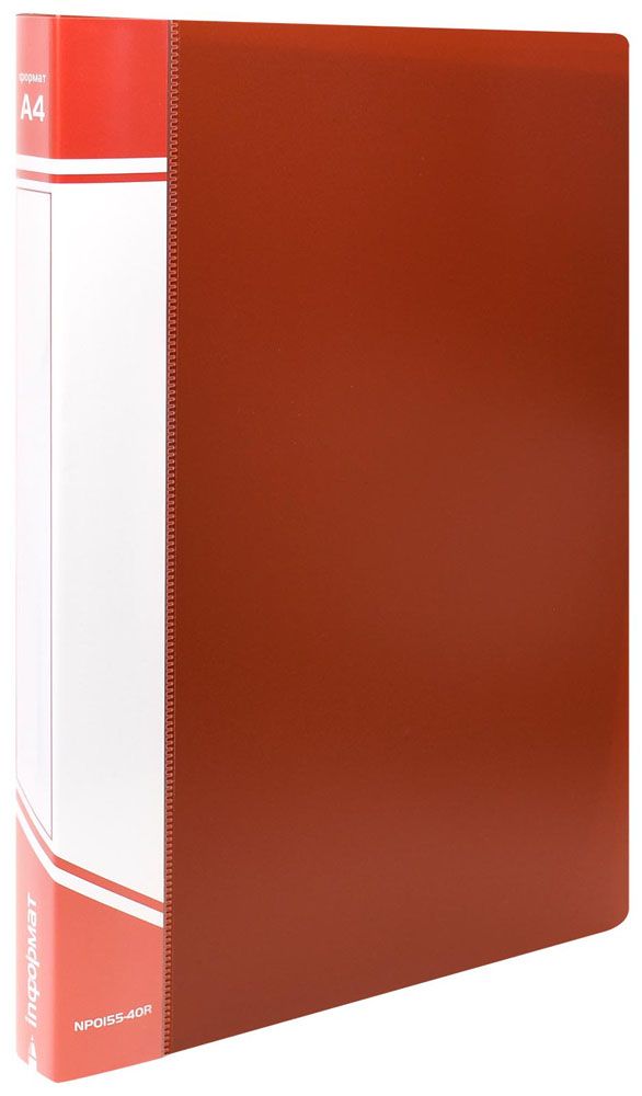 Прочная папка формата A4 из высококачественного пластика с прозрачными карманами-файлами. Внутренние файлы плотно закреплены в корешке папки. Имеет прозрачный карман с вкладышем для маркировки. Толщина пластика — 600 мкм, 40 файлов.