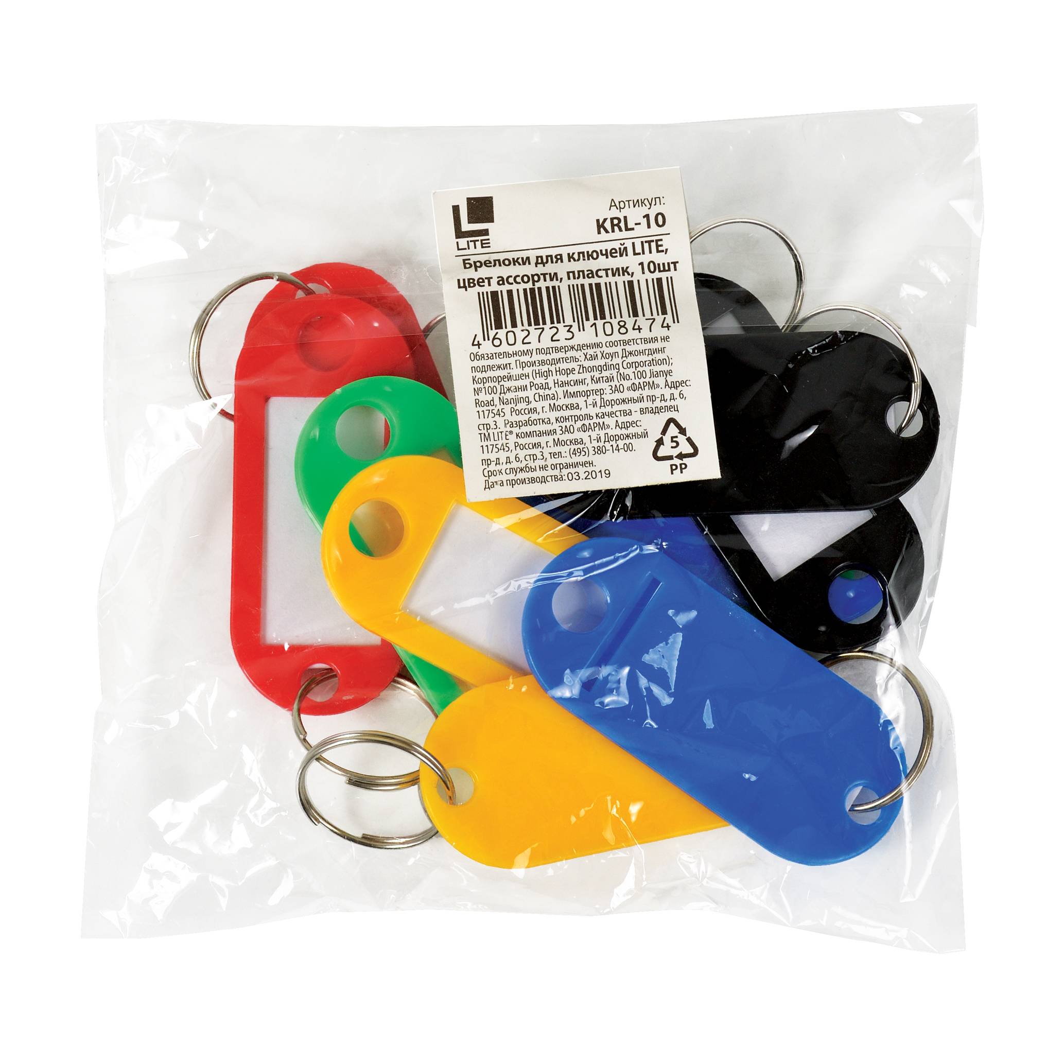 Основные характеристики:- Количество в упаковке – 10 штук и 100 штук.- Размер брелока – 50х21 мм.- Брелоки снабжены информационным окном (30х14 мм).- Содержат бумажную вставку для подписи, прикрытую защитным пластиком.- Оснащены никелированным кольцом.- Цвет корпуса – ассорти (5 цветов – черный, зеленый, красный, синий и желтый).