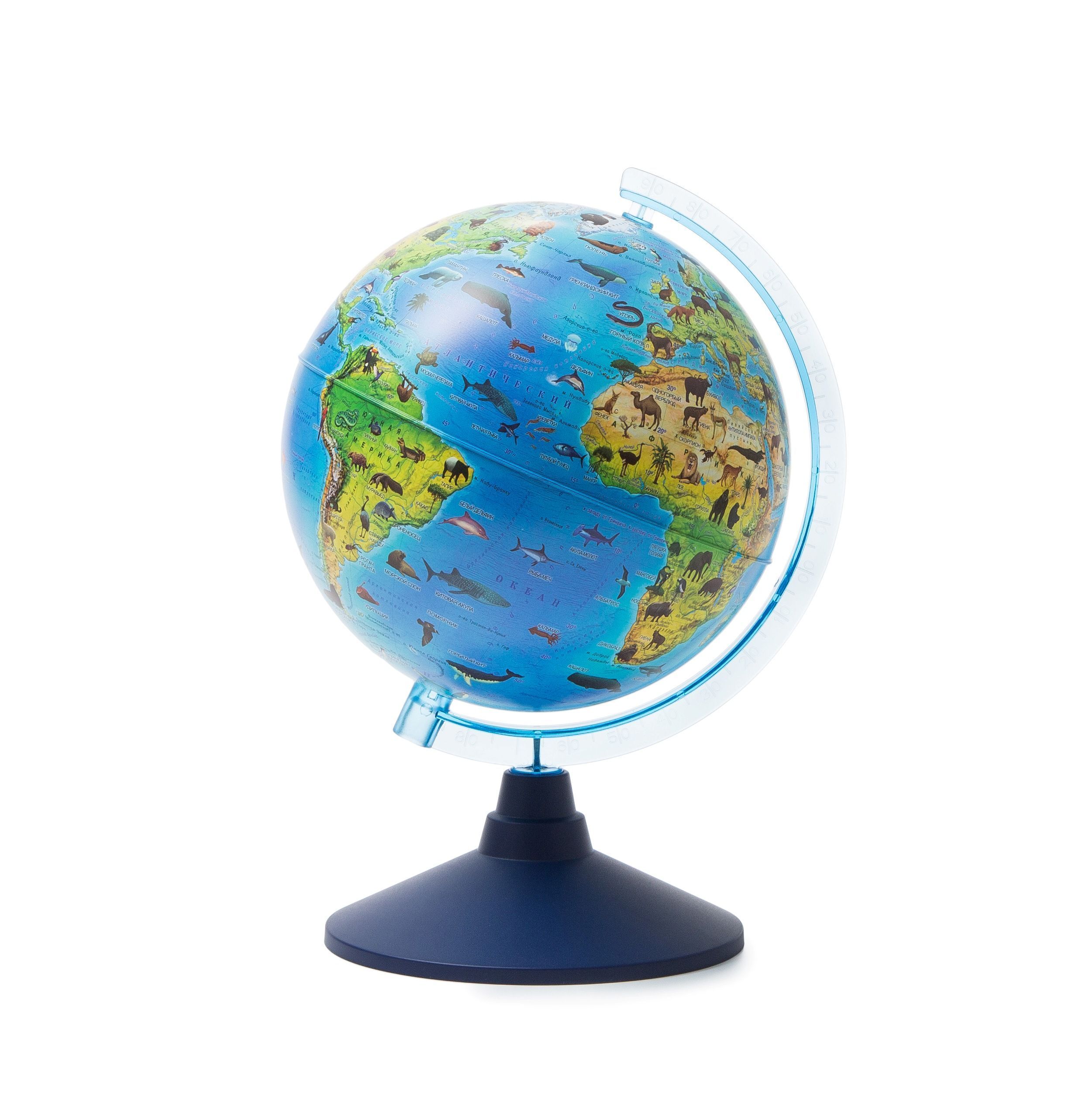 Глобус зоогеографический для детей от 3-х лет. Сфера изготовлена из пластика. Диаметр сферы 21 см. Устойчивая настольная подставка из синего пластика. Карта максимально подробная для данного диаметра глобуса. Линия экватора выпуклая для тактильно восприятия. Физическая карта с нанесением изображений животных в местах их обитания.