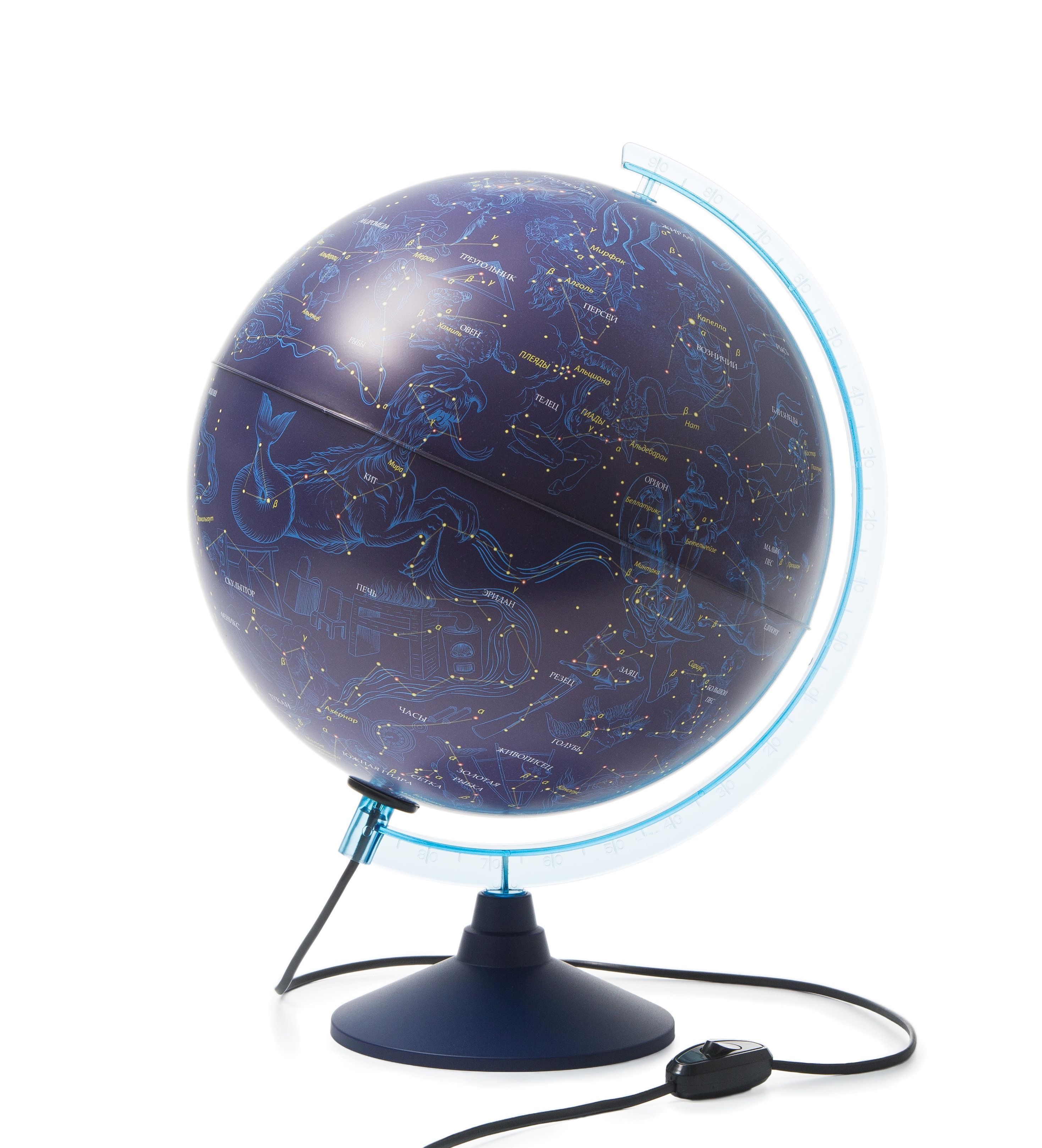 Глобус звездного неба - это фантастика для тех, кто любит астрономию. Сфера изготовлена из пластика. Диаметр сферы 32 см. Устойчивая настольная подставка из пластика синего цвета. Карта максимально подробная для данного диаметра глобуса. Линия экватора выпуклая для тактильно восприятия. Карта физическая. Изображение карты - звездное небо. Лампа подсветки съемная, цоколь Е14.
