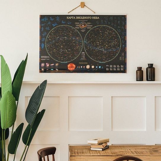 Без использования приложения карта Звездного неба является серьезным настольным учебным пособием. На карте с соблюдением масштаба изображены звезды, планеты и созвездия Северного и Южного полушарий. На свободных полях карты изображены самые известные галактики, планеты Солнечной системы, крупные, а также зодиакальные созвездия в художественном стиле.Небольшой размер карты (59*42 см) дает возможность легко разместить ее на столе или парте школьника. Капсульная плотная ламинация защищает обе стороны карты от истирания, а изображение - от механических повреждений и выцветания.
