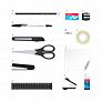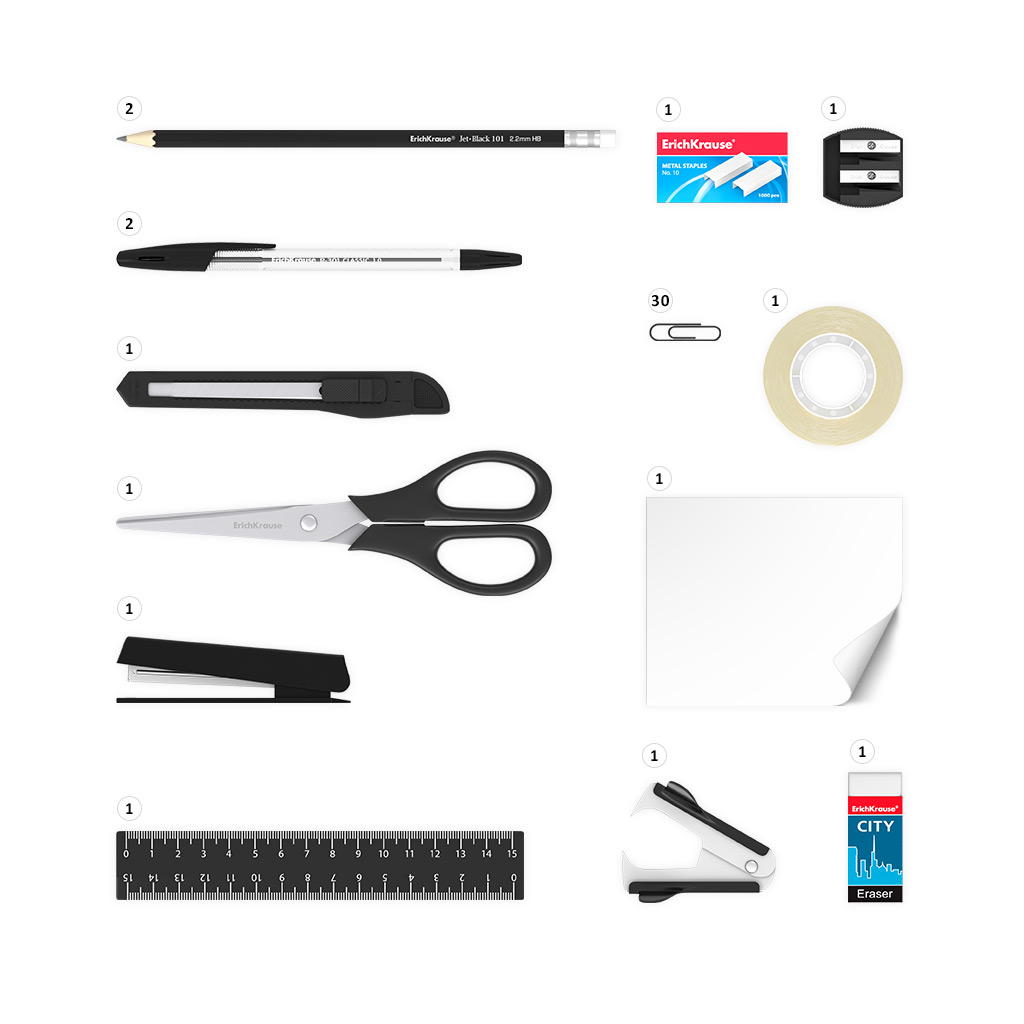 | Комплектация набора: | 2 ручки, 2 карандаша, линейка, точилка, ластик, 30 скрепок, степлер №10, 1000 скоб, ножницы, нож канцелярский, блок бумаги для записей, клейкая лента |