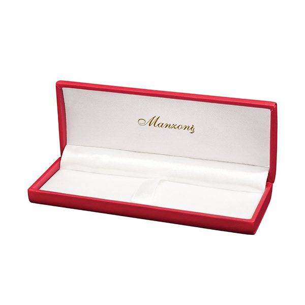 Подарочный футляр красного цвета изготовлен из искусственной кожи. Предназначен для 1 ручки Manzoni. Логотип золотого цвета. Внутренняя отделка из белой атласной ткани.