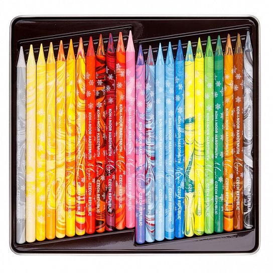Мягкий грифель, насыщенные цвета и необычный эффект при рисовании ценят как дети, так и художники-графисты во всем мире. Для создания неповторимых эффектов рисунка в набор входит карандаш-растушевка. Набор упакован в специальную металлическую коробку с рождественским дизайном и станет прекрасным подарком на Рождество и Новый год.
