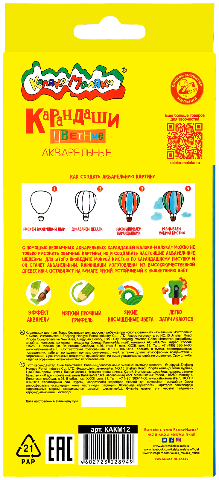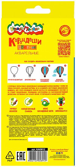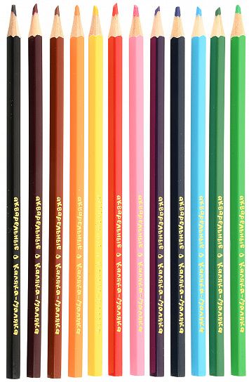 Акварельные цветные карандаши Каляка-Маляка® совмещают в себе свойства цветного карандаша и акварельных красок. Нарисуйте рисунок карандашом, а затем проведите по нему мокрой кистью — краски намокнут и расплывутся, превратив карандашный рисунок в акварельную картину.