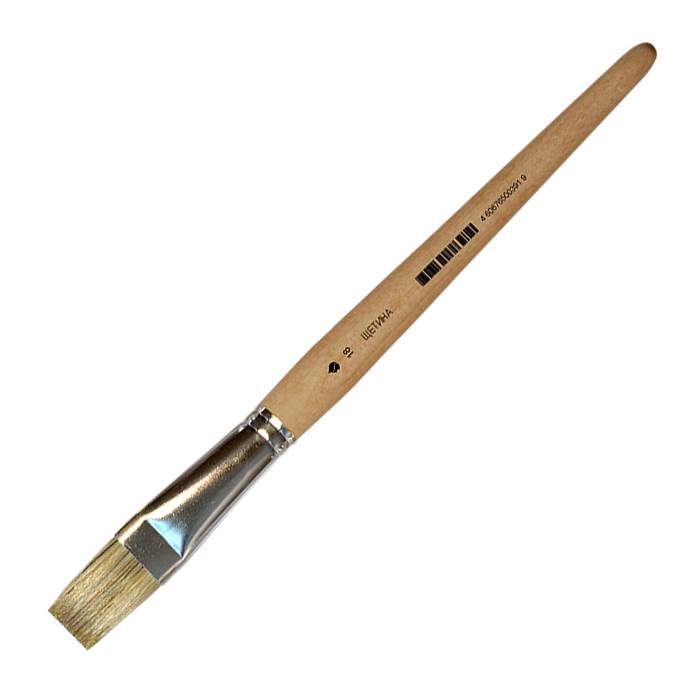 Основной показатель, по которому оцениваются щетинные кисти, - упругость. Чем гуще краска, тем тверже должен быть волос. Вслед за упругостью важнейшей характеристикой является расщепленный кончик - он способствует хорошей наполняемости кисти и ровному нанесению краски. Кисть предназначена для работы с "тяжелыми" красками: маслом, акрилом, темперой, гуашью. Ручка кисти деревянная пропитанная, обойма жестяная шовная.