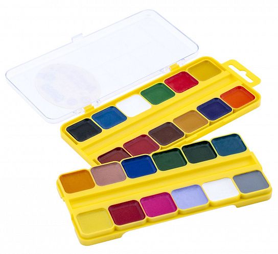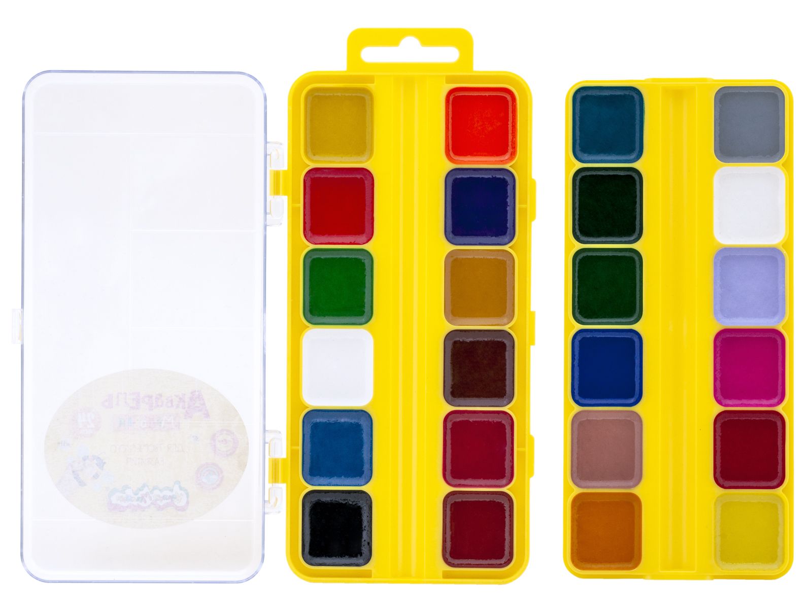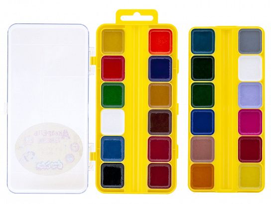 В наборе 24 ярких насыщенных цветов. Краски быстро высыхают и не портятся со временем. Изготовлены на основе натуральных компонентов, не содержат токсичных веществ. Безопасны при использовании по назначению.