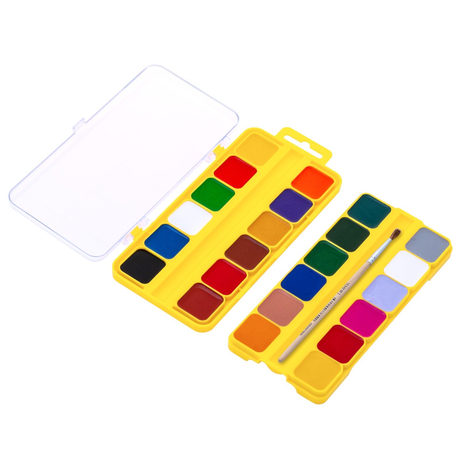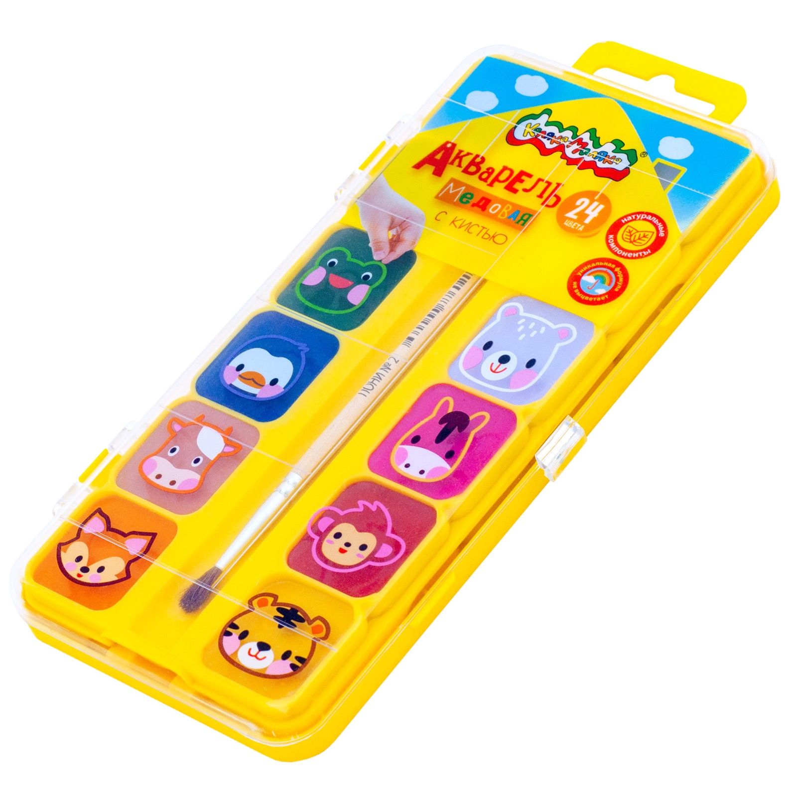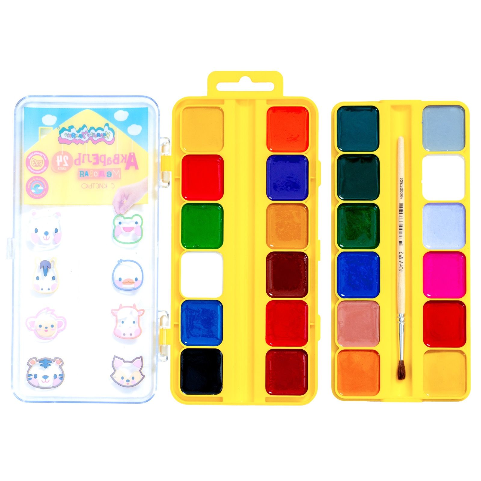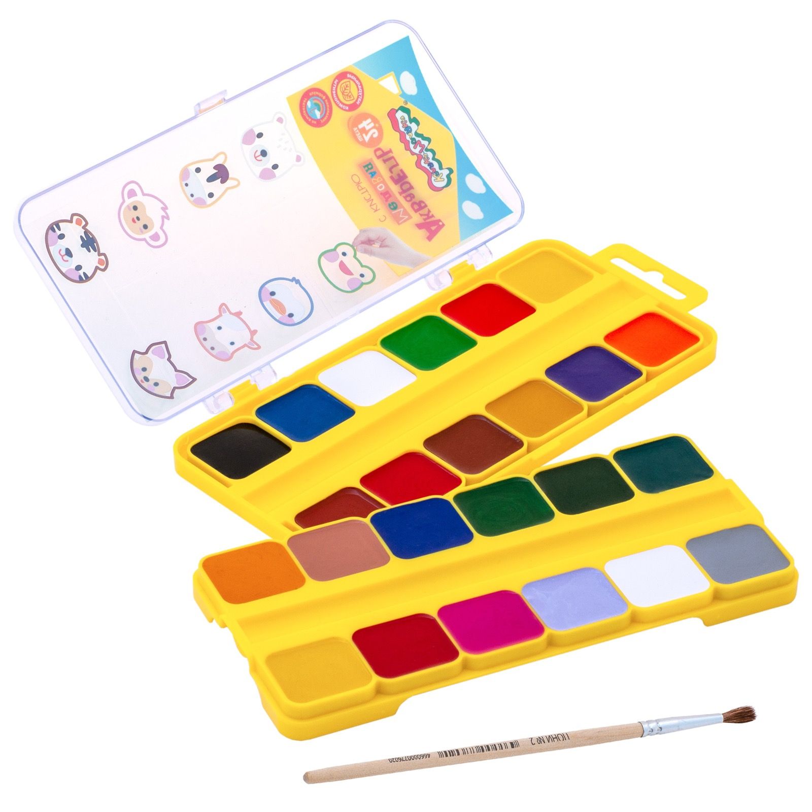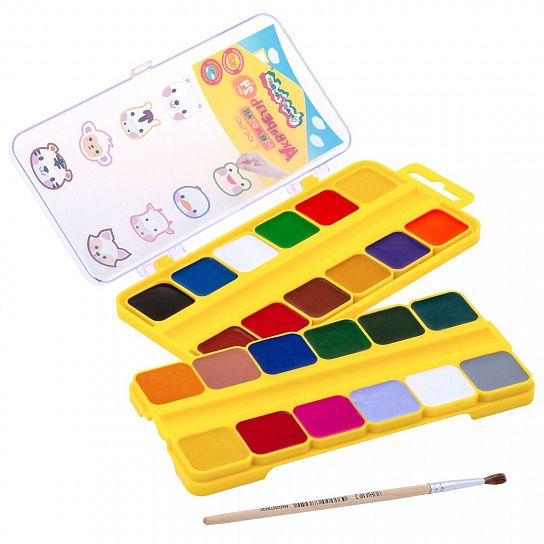 Акварель 24 цвета с кистью в ярком жёлтом пенале в эксклюзивном цвете Каляка-Маляка®! Каждая кювета украшена своим персонажем, чтобы ребенок мог запоминать цвета. Пленка защищает краски от перетекания и попадания пыли.