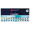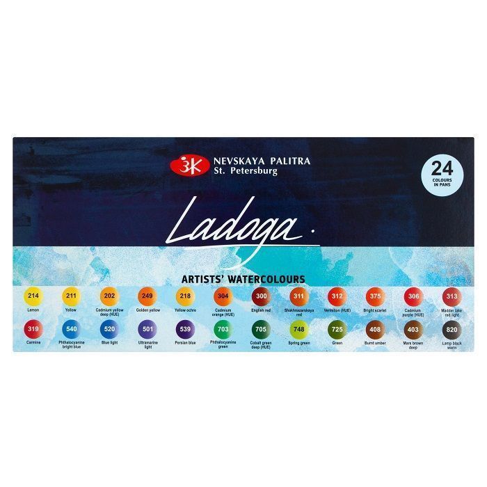 Акварель «Ладога» выпускается в кюветах объёмом 2,5 мл в экономичной упаковке без фольги и этикетки. Набор акварели «Ладога» из 24 цветов представлен в пластиковом коррексе и картонном чехле.