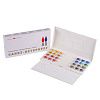 Состав набора: кадмий лимонный, кадмий желтый средий, охра желтая, золотистая, тициановая, кадмий красный светлый, охра красная железоокисная светло-красная, карминовая, краплак красный светлый, фиолетовая, ультрамарин, ярко-голубая, кобальт синий, индиго, желто-зеленая, изумрудно-зеленая, зеленая, сиена натуральная, умбра, умбра, жженая, марс коричневый, сепия, нейтрально-черная.