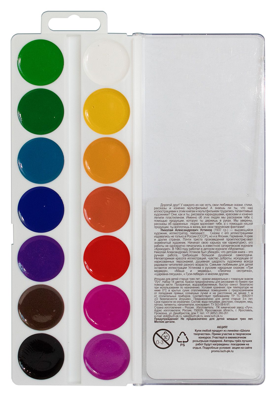 Медовая акварель изготовленная по классической рецептуре с яркими и чистыми цветами. Краска в подложке расположена группами: оттенки. Прекрасно размывается и разносится по поверхности бумаги, имея прозрачную основу без вкраплений. Краски смешиваются между собой, сохраняя насыщенность цвета. Краска легко смывается с рук и одежды.