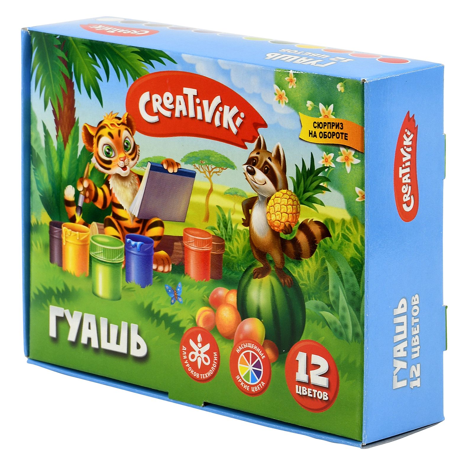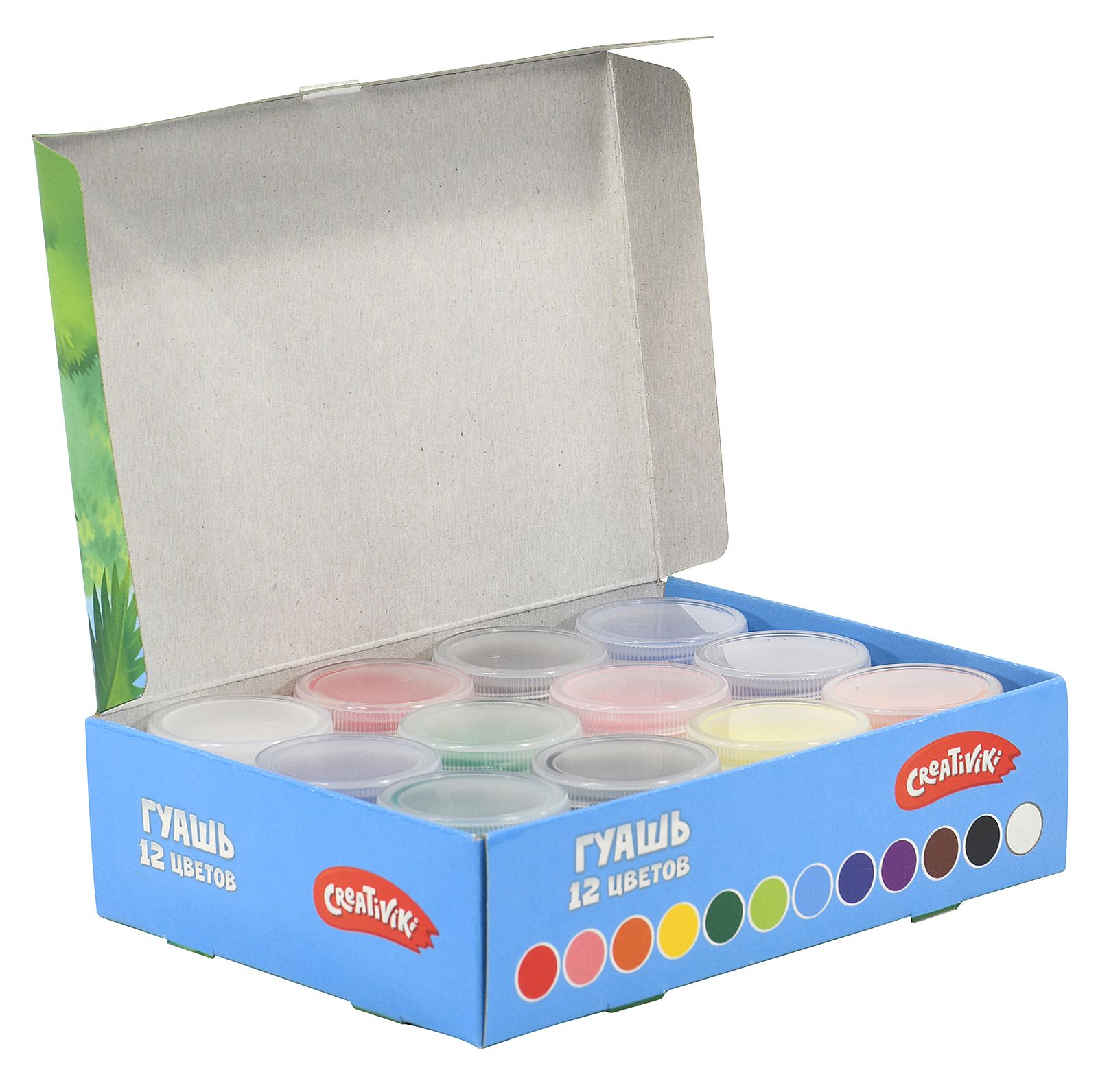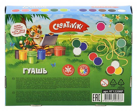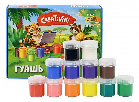Гуашевые краски — один из любимых детских материалов для рисования. Обладая высокой пигментированностью и сочностью цветов, краски Creativiki невероятно комфортны в использовании: они обладают хорошей укрывистостью. Яркие и красивые гуашевые краски имеют самый популярный объем — 20 мл. Каждая баночка плотно закрывается завинчивающейся крышкой.