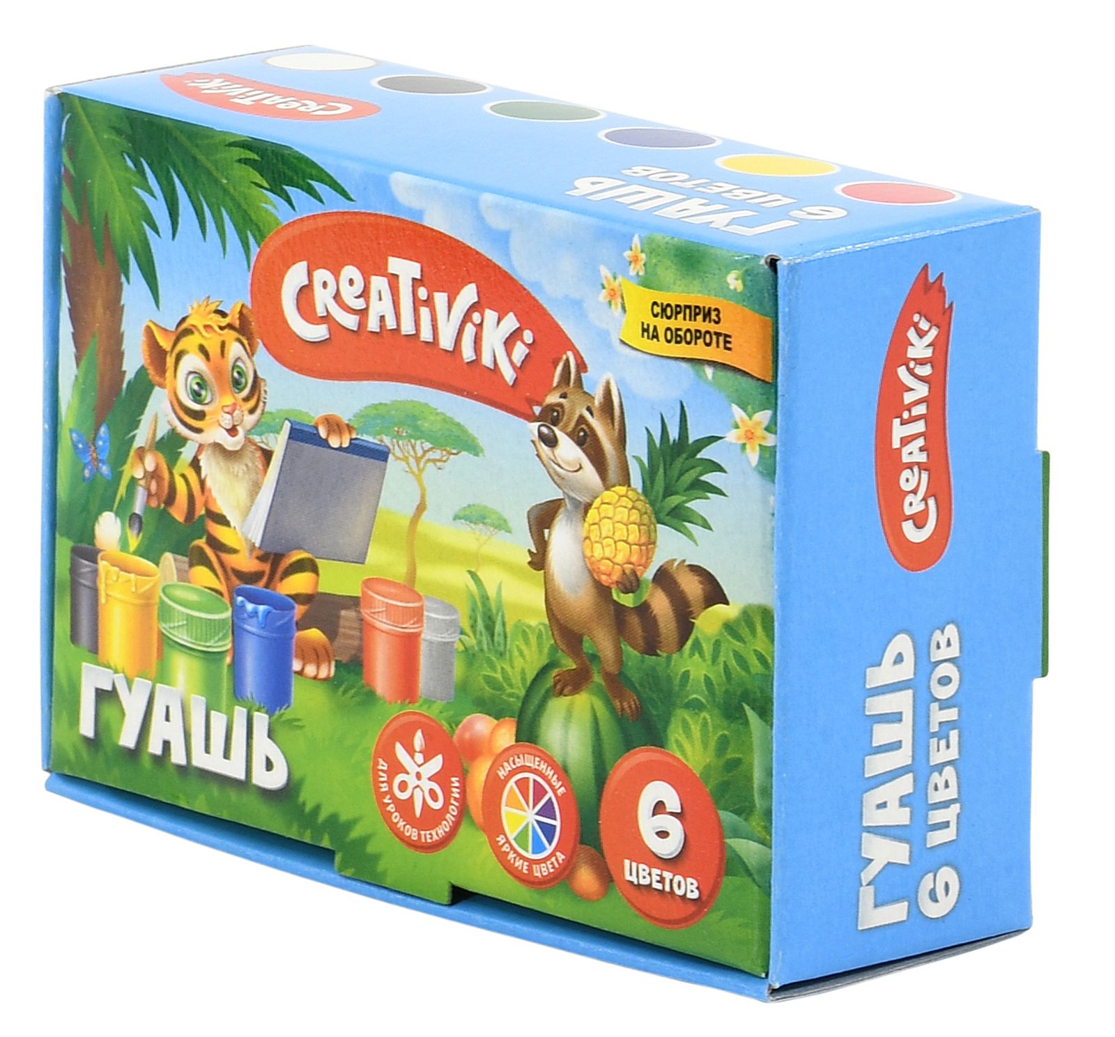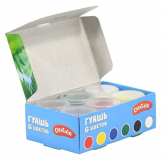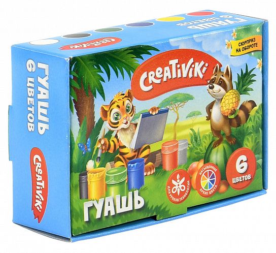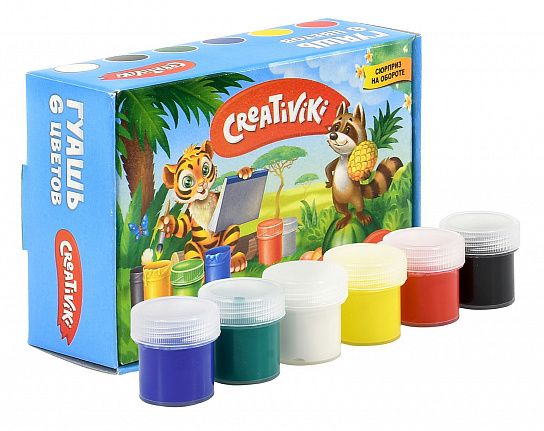 Обладая высокой пигментированностью и сочностью цветов, краски Creativiki невероятно комфортны в использовании. Яркие и красивые гуашевые краски имеют компактный объем баночек — 10 мл., каждая из которых имеет плотно закрывающуюся крышечку, что позволяет брать гуашь в школу и детский сад. Разнообразие оттенков поможет раскрыть творческий потенциал малыша и осуществить самые творческие фантазии!