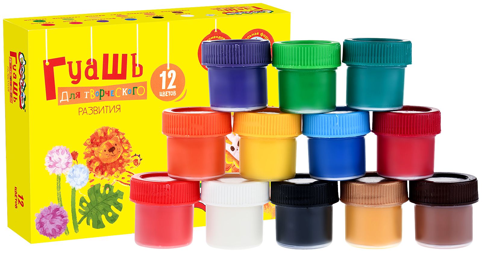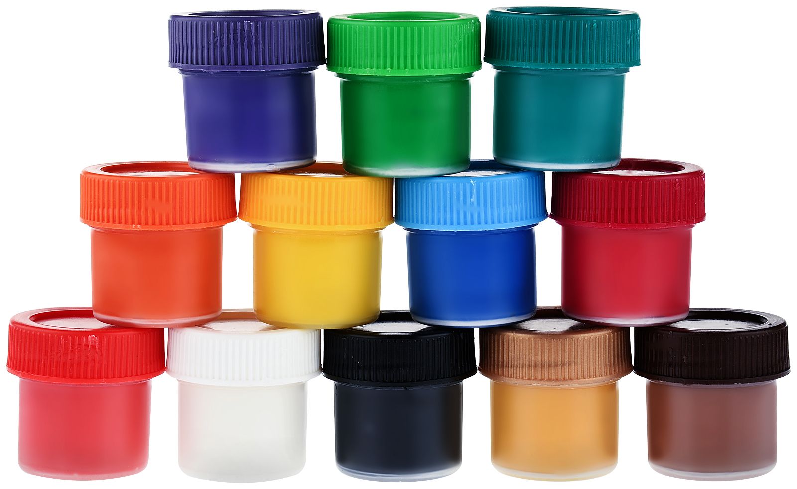 - Гуашь находится в пластиковых герметичных баночках с завинчивающейся цветной крышкой.