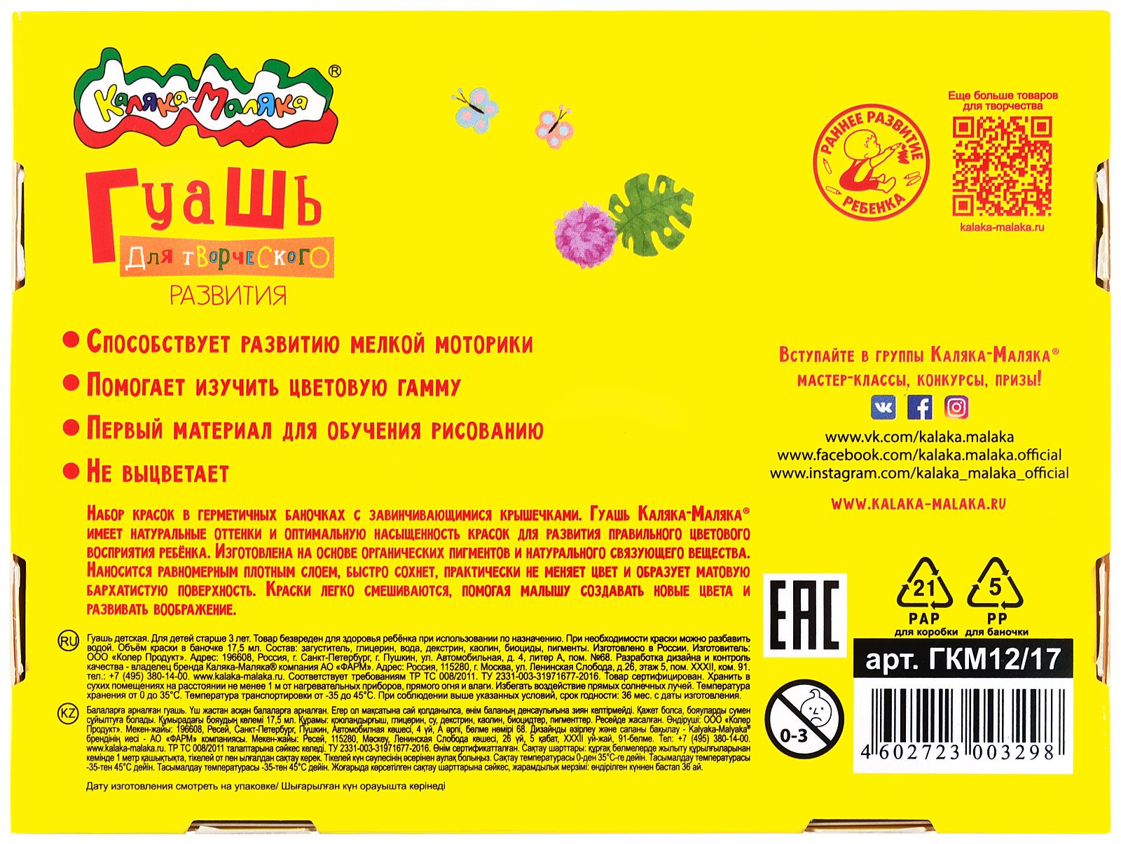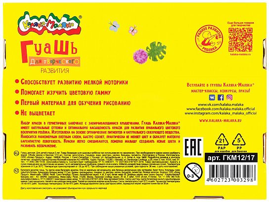 Гуашь Каляка-Маляка® предназначена для детского творчества. Отлично подходит в качестве первого материала для обучения рисованию. Имеет оптимальное цветовое сочетание, обладает хорошей насыщенностью и чистотой тона. Отличается прекрасной кроющей способностью. При необходимости разбавляется водой.
