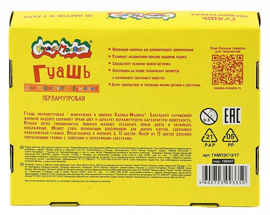 Гуашь Каляка-Маляка® отличается прекрасной кроющей способностью. При необходимости разбавляется водой. Краски легко смываются с рук и одежды. Безвредны для здоровья ребёнка при использовании по назначению. Изготовлены на основе натуральных компонентов и высококачественных пигментов.