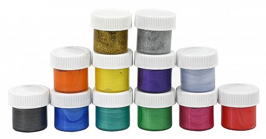 - В набор входят 2 геля с блестками: золотой и серебряный, а также 10 перламутровых оттенков гуаши: серый, зеленый, бирюзовый, коралловый, желтый, синий, оранжевый, фиолетовый, розовый, чёрный.