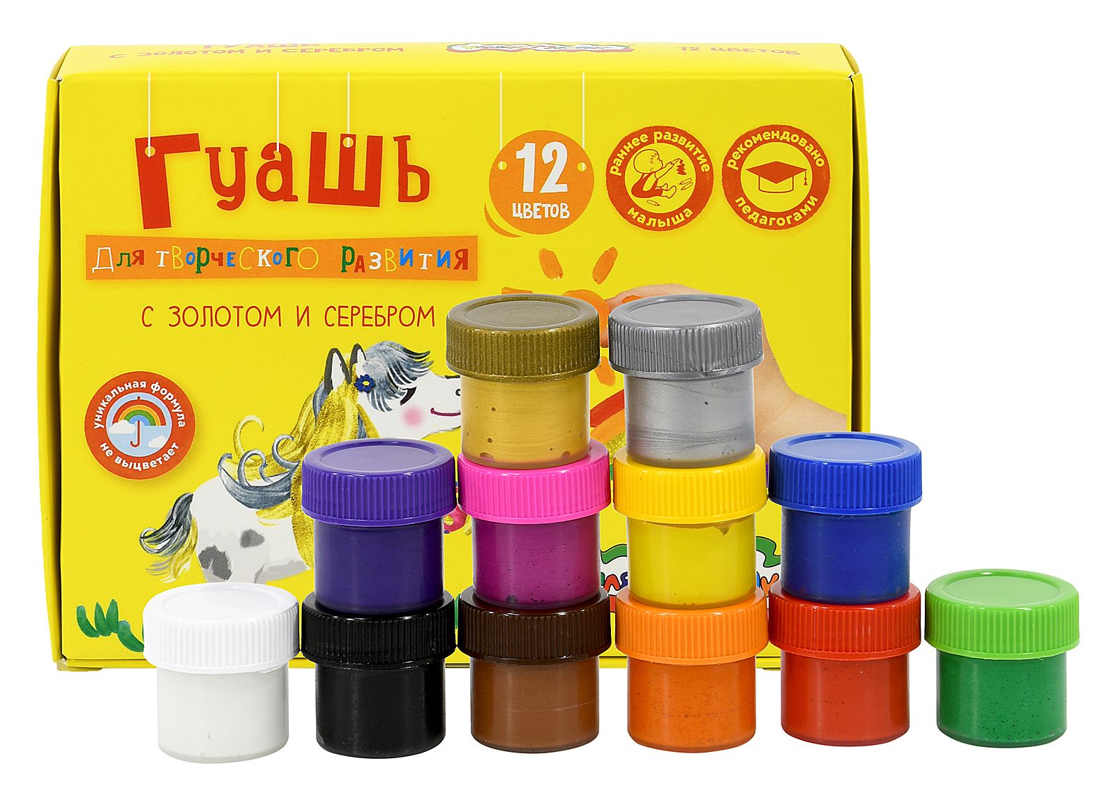 - В набор входят 2 необычных цвета: золотой и серебряный, а также 10 классических цветов: черный, зеленый, красный, желтый, белый, синий, коричневый, оранжевый, фиолетовый, розовый.