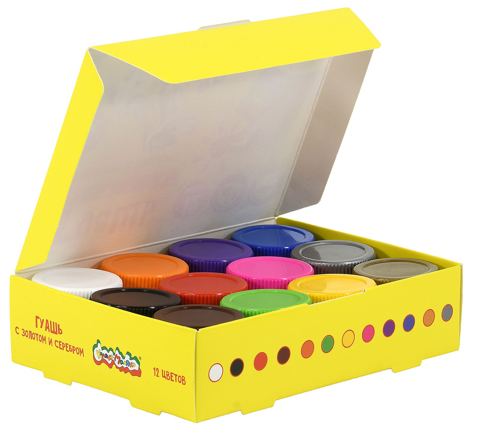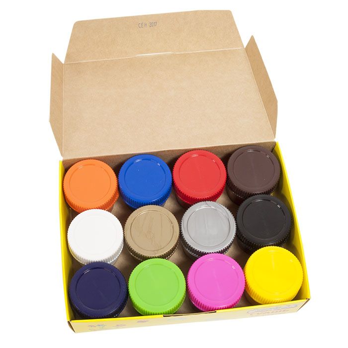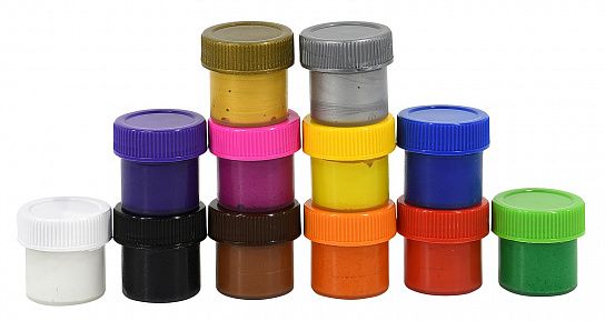- Гуашь находится в пластиковых герметичных баночках с завинчивающейся цветной крышкой.