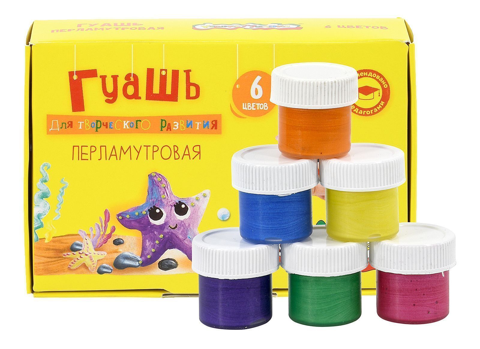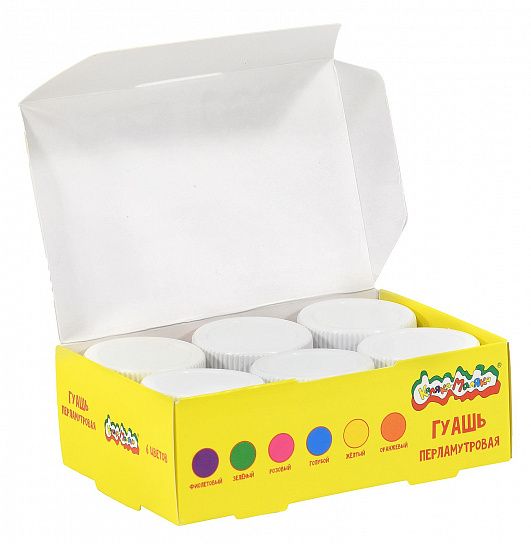 - В набор входят 6 перламутровых оттенков гуаши: зеленый, желтый, синий, фиолетовый, оранжевый, розовый.