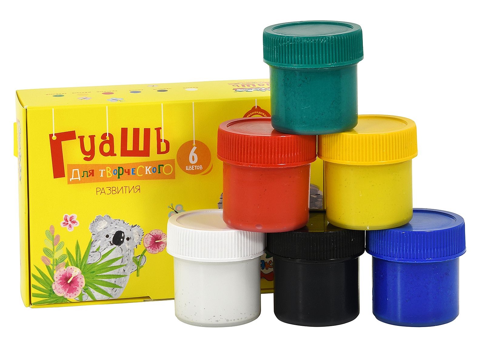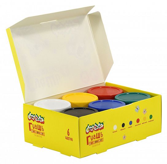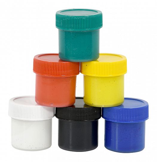- Гуашь находится в пластиковых герметичных баночках с завинчивающейся цветной крышкой.