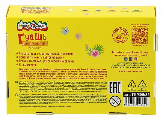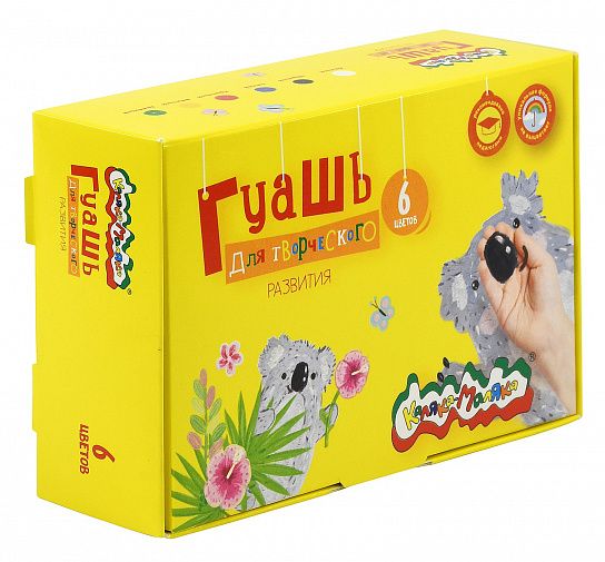 Гуашь Каляка-Маляка® предназначена для детского творчества. Отлично подходит в качестве первого материала для обучения рисованию. Имеет оптимальное цветовое сочетание, обладает хорошей насыщенностью и чистотой тона. Отличается прекрасной кроющей способностью. При необходимости разбавляется водой.