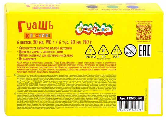 Гуашь Каляка-Маляка® КЛАССИКА предназначена для детского творчества. Отлично подходит в качестве первого материала для обучения рисованию. Имеет оптимальное цветовое сочетание, обладает хорошей насыщенностью и чистотой тона. Отличается прекрасной кроющей способностью. При необходимости разбавляется водой.