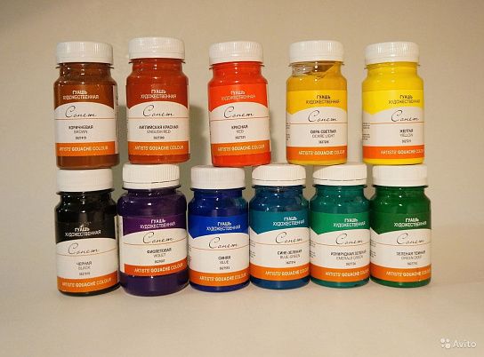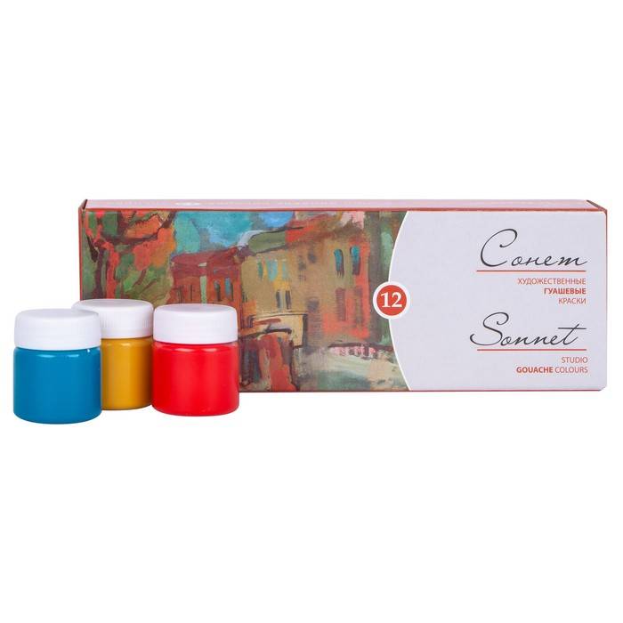 Художественные гуашевые краски "Сонет" предназначены для художественных и художественно-оформительских работ. Краски изготовлены по новой технологии, аналогичной производству акриловых красок: в рецептуре использованы пигментные пасты и в качестве связующего — синтетическое связующее.