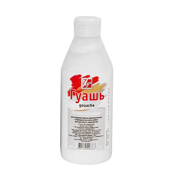 Гуашь белила титановые в бутылке 500 мл изготовлены на основе натуральных компонентов и высококачественных пигментов. Бутылка снабжена удобной в использовании крышкой Флип-топ с контролем дозировки краски.