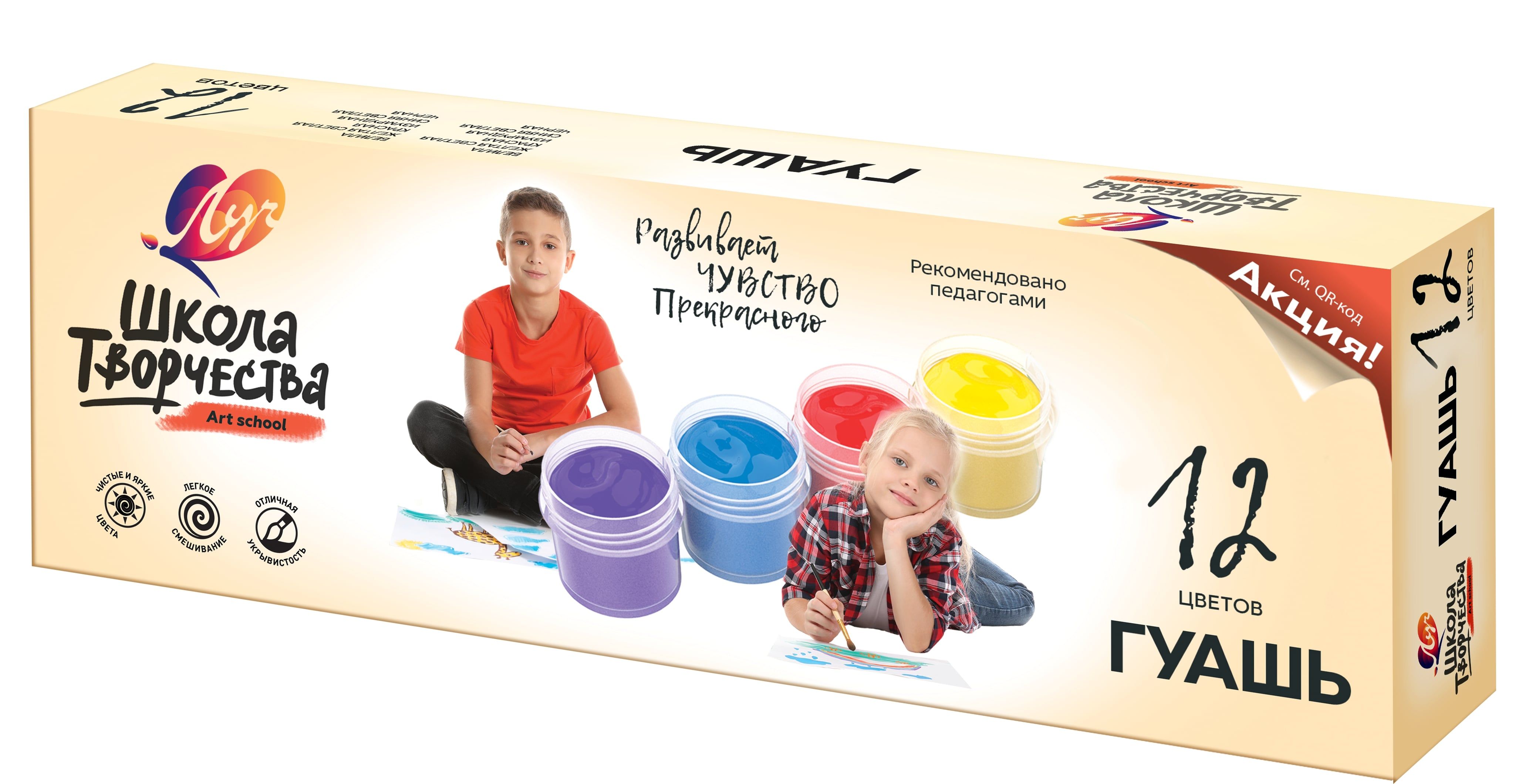 12 цветов по 20 мл, индивидуальная наклейка на баночке, указывающая на цвет краски.