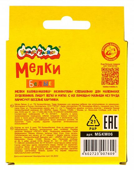 Мелки Каляка-Маляка® идеально подойдут для доски, рисования на асфальте, дереве и других материалах, а самое главное — они легко стираются! Специальная мягкая текстура позволяет ребенку аккуратно и с удовольствием создавать свои шедевры.