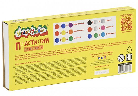 Пластилин Каляка-Маляка® - идеальный инструмент для творческого развития ребенка. Пластилин имеет яркие цвета, легко разминается, смешивается, держит форму и не пачкает руки.Изготавливается на современном российском производстве, соответствует всем стандартам безопасности детской продукции.