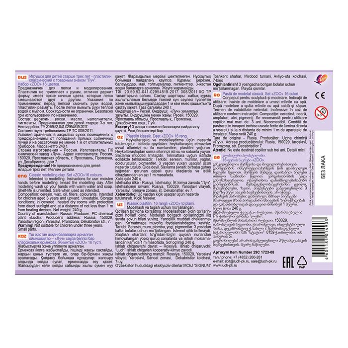 Пластилин "Zoo" — это традиционный классический пластилин в картонной коробке, в котором высокое качество продукта сочетается с доступной ценой. Безопасность и качество пластилина подтверждаются протоколами испытаний (испытания проходили в сертификационном центре Германии, на упаковке знак CE).