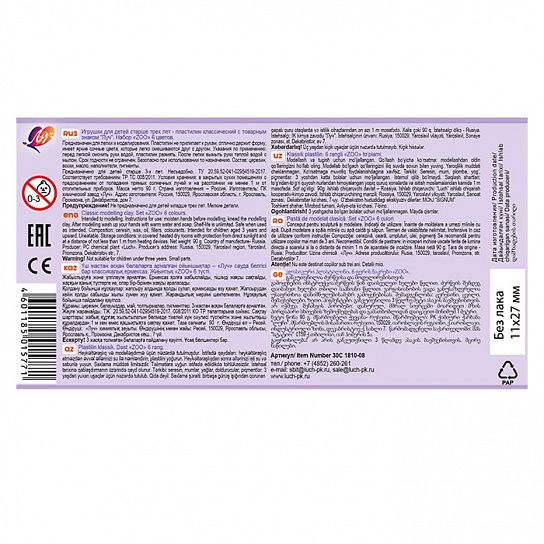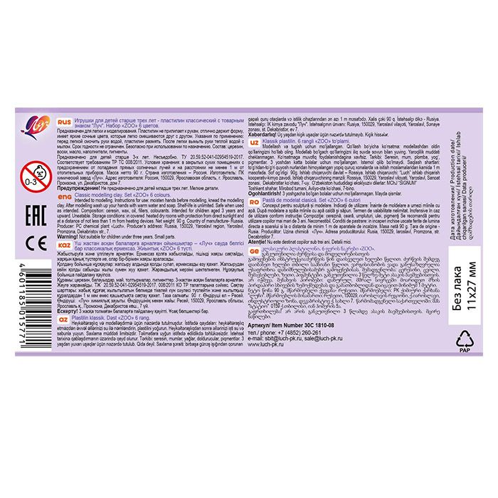 Пластилин "Zoo" — это традиционный классический пластилин в картонной коробке, в котором высокое качество продукта сочетается с доступной ценой. Безопасность и качество пластилина подтверждаются протоколами испытаний (испытания проходили в сертификационном центре Германии, на упаковке знак CE).