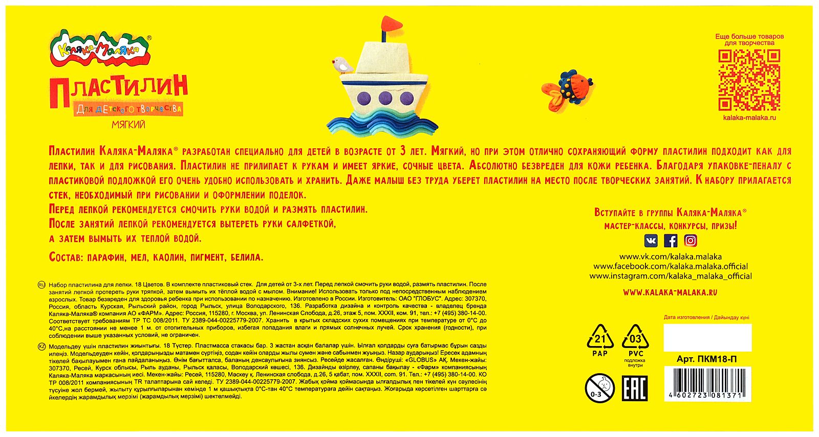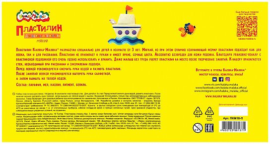 Пластилин Каляка-Маляка® — идеальный инструмент для творческого развития ребенка. Пластилин имеет яркие цвета, легко разминается, смешивается, держит форму и не пачкает руки.Изготавливается на современном российском производстве, соответствует всем стандартам безопасности детской продукции.