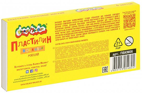 Пластилин Каляка-Маляка® — идеальный инструмент для творческого развития ребенка. Пластилин имеет яркие цвета, легко разминается, смешивается, держит форму и не пачкает руки.Изготавливается на современном российском производстве, соответствует всем стандартам безопасности детской продукции.