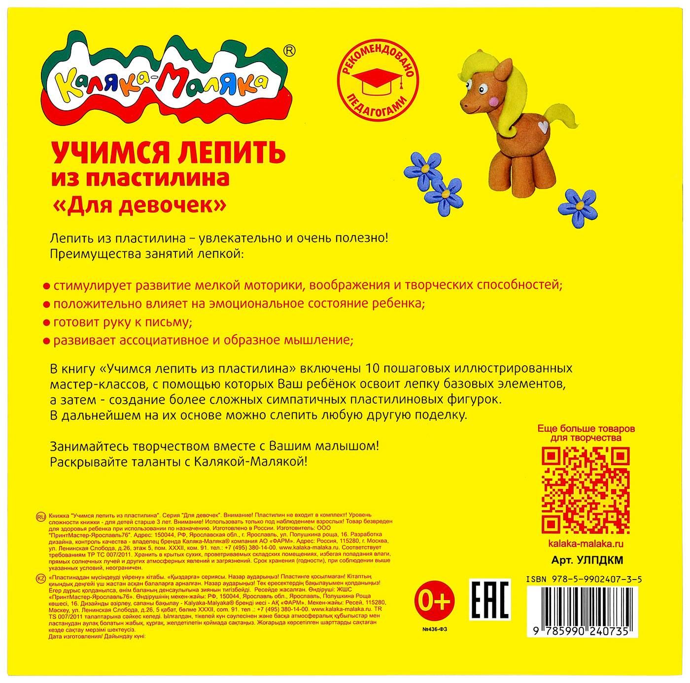 Книжка Каляка-Маляка УЧИМСЯ ЛЕПИТЬ ИЗ ПЛАСТИЛИНА. ДЛЯ ДЕВОЧЕК 10 мастер классов 3+