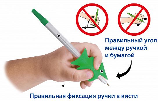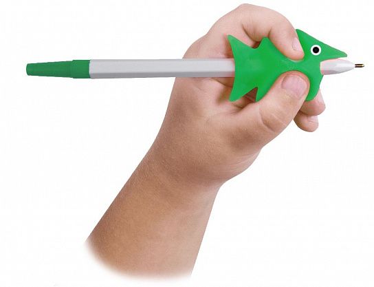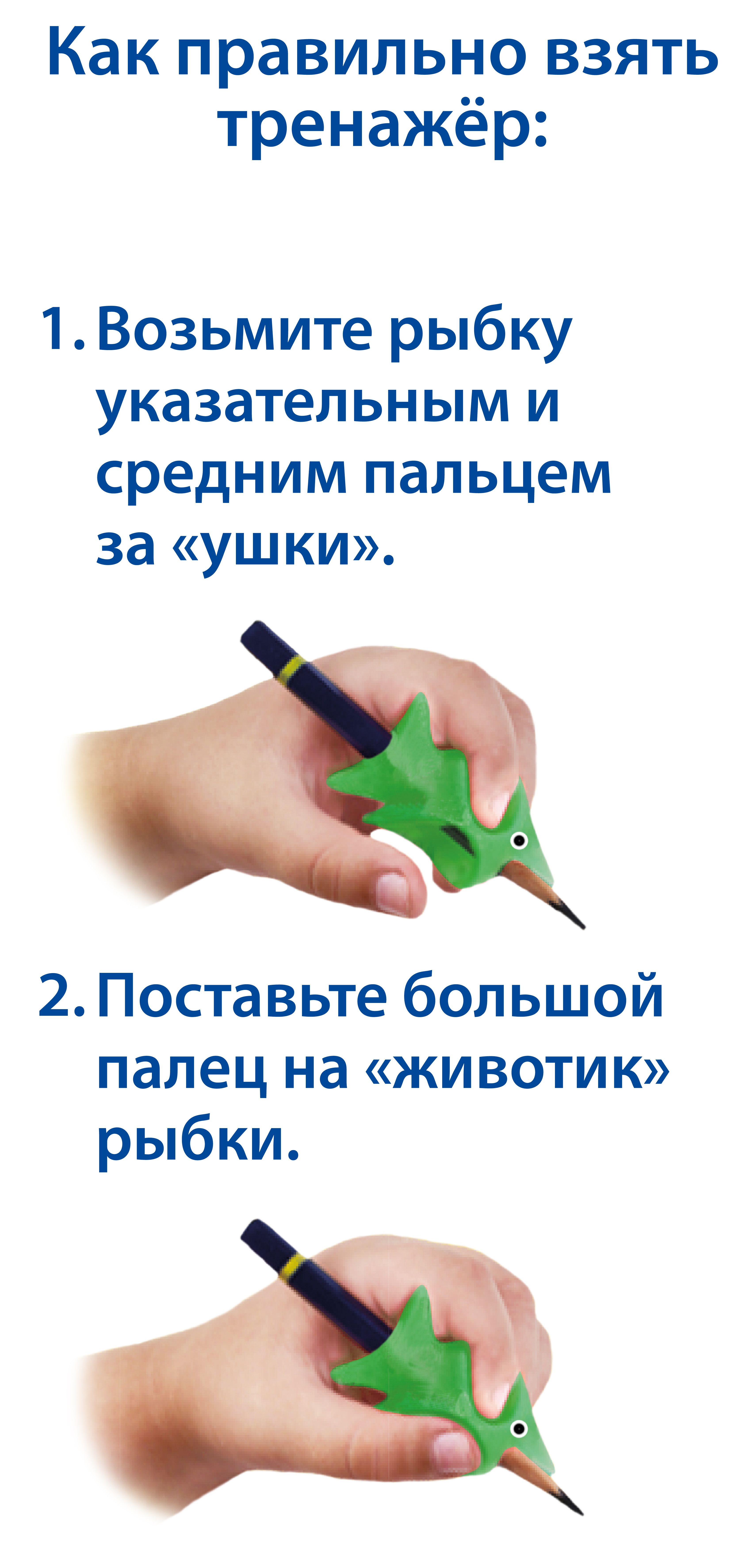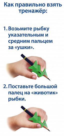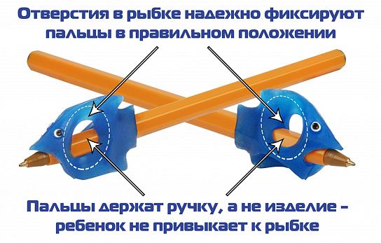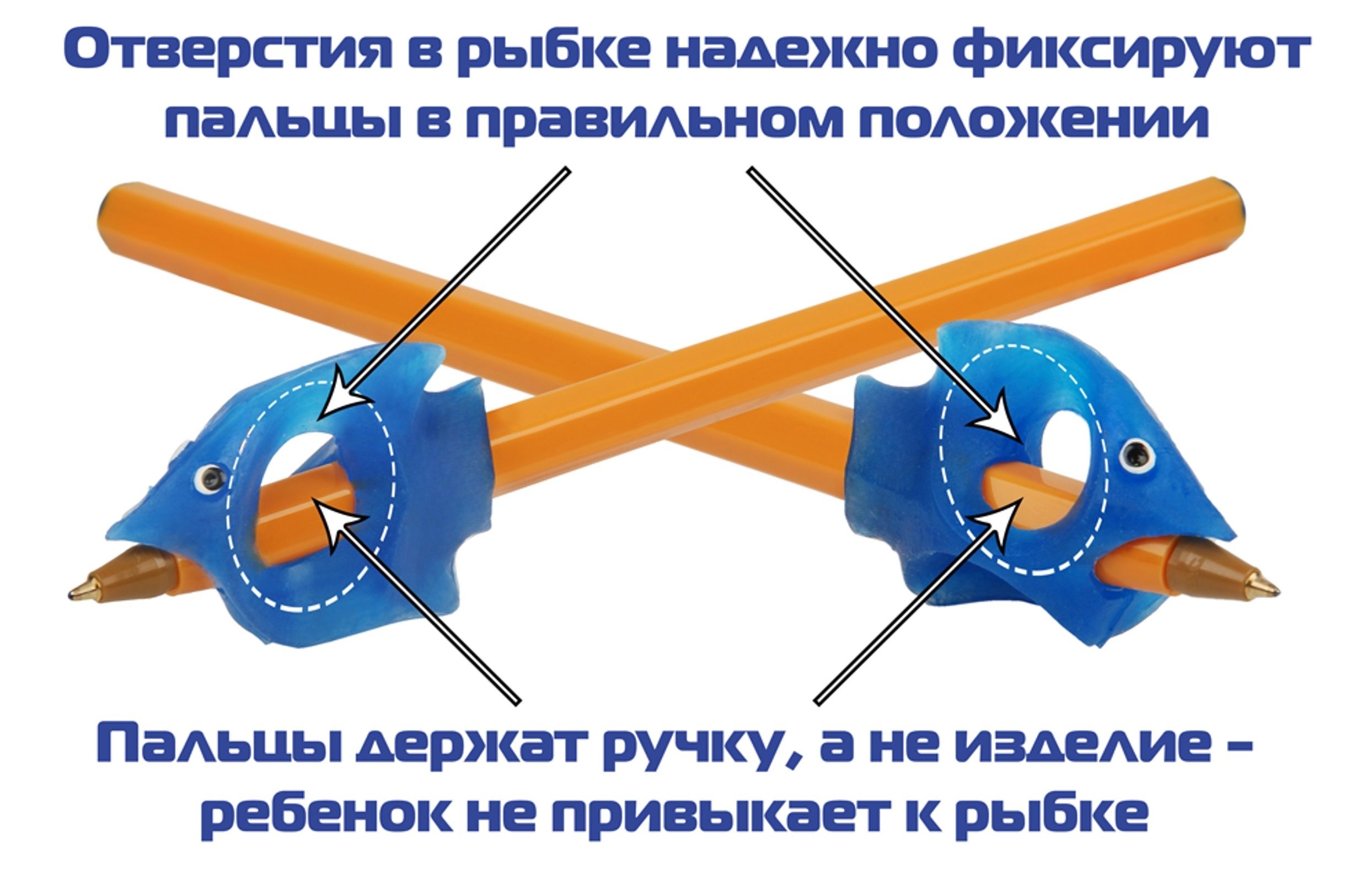 «Ручка-самоучка» не вызывает привыкания, т.к. ребёнок держит пальцами не саму рыбку, а через её сквозные выемки – стандартную ручку. Эту ручку можно заменить на любую другую или на карандаш /для детей 3-5 лет/ с диаметром корпуса от 7,2 до 9 мм.