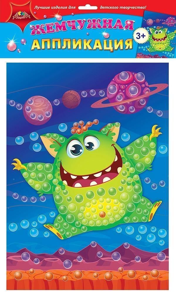 Набор для детского творчества "Жемчужная аппликация" понравится детям от 3-х лет. На цветной картонной основе цветом и контуром показаны места, куда необходимо приклеить перламутровые пластмассовые полужемчужины разного цвета и диаметра. Элементы имеют клеевой слой, поэтому вы обойдетесь без клея. В результате получится яркая картинка.