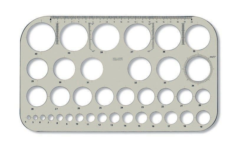 Шаблон кругов KOH-I-NOOR изготовлен высококачественного дымчатого полистирола. Шкалы печатаются с использованием точной технологии трафаретной печати. Печать устойчива к износу при обычном использовании.