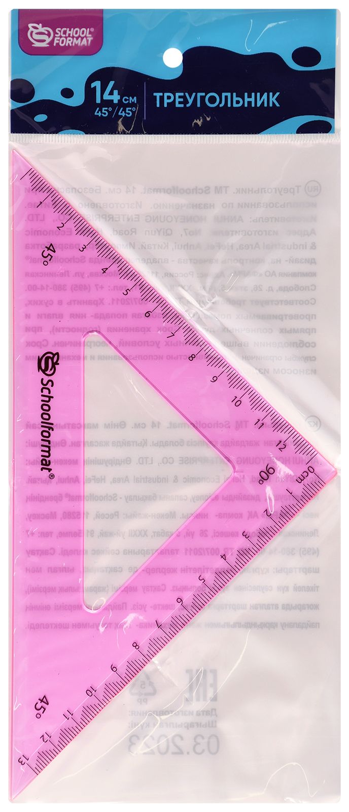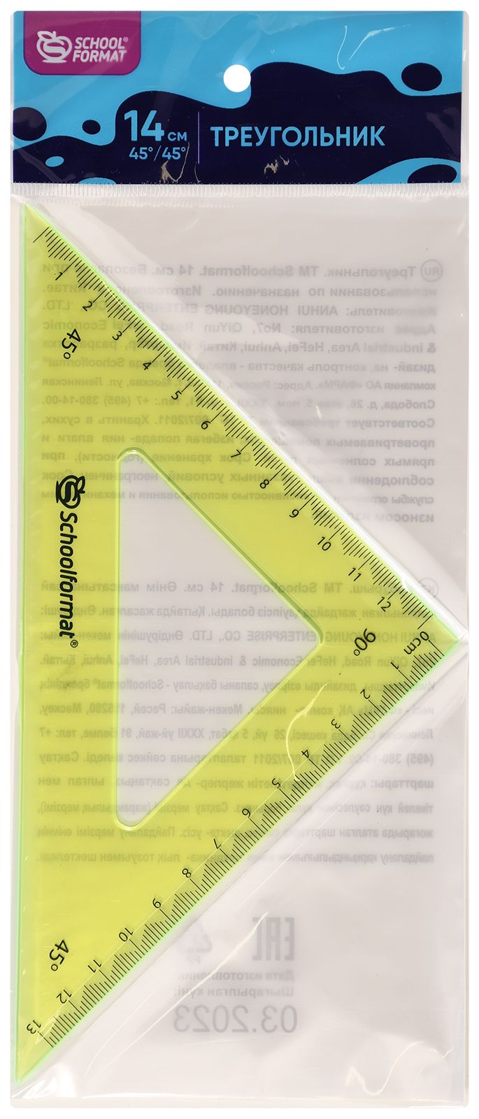 Длина шкалы – 14 см, угол наклона - 45°. Имеет четкое нанесение шкалы делений, выполнена из прочного пластика, что делает ее устойчивой к деформации. Отлично справится с задачей построения ровных чертежей и подчеркивания необходимых слов.