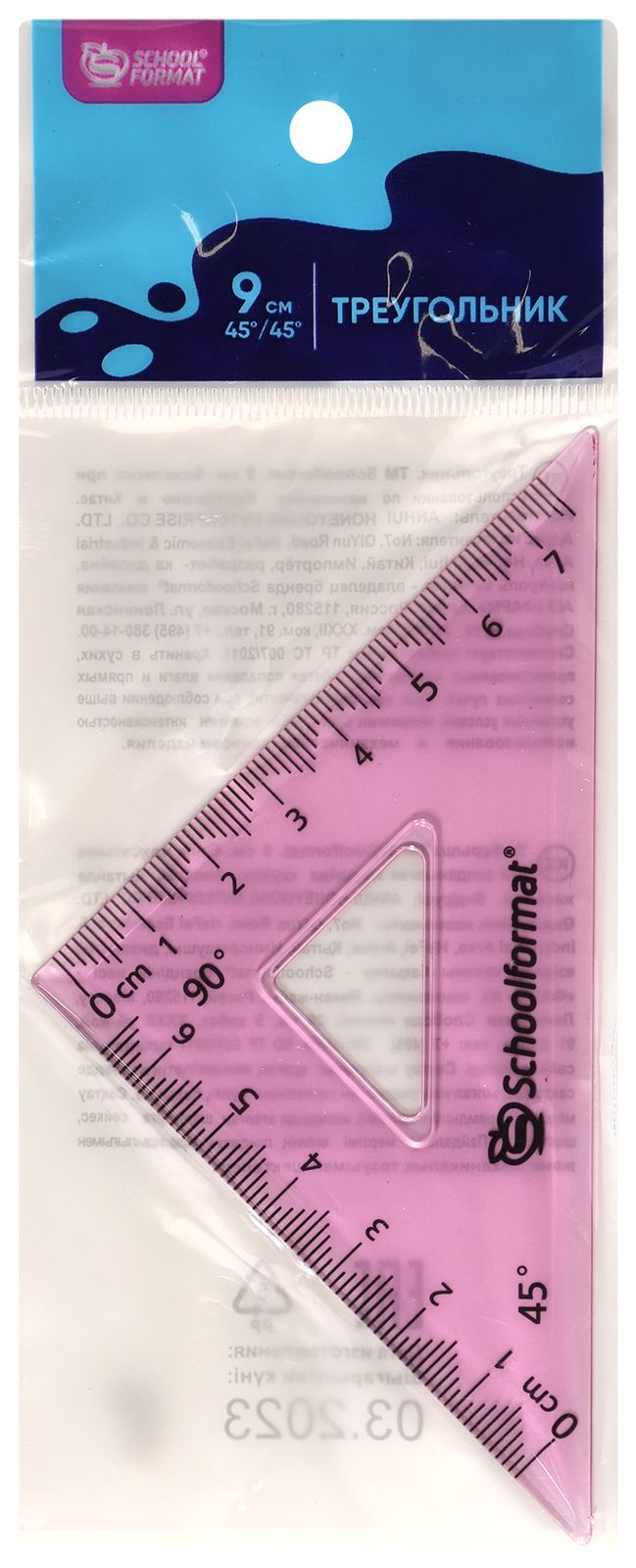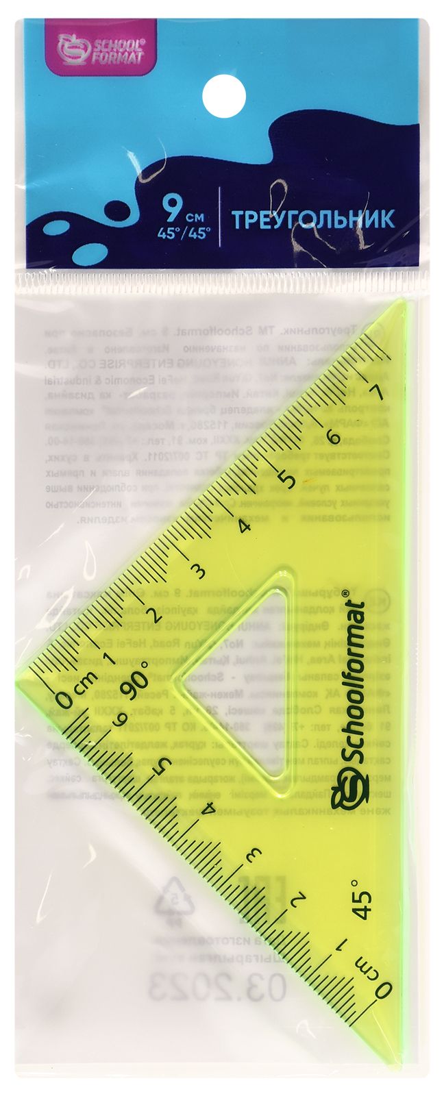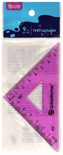 Длина шкалы – 9 см, угол наклона - 45°. Имеет четкое нанесение шкалы делений, выполнена из прочного пластика, что делает ее устойчивой к деформации. Отлично справится с задачей построения ровных чертежей и подчеркивания необходимых слов.