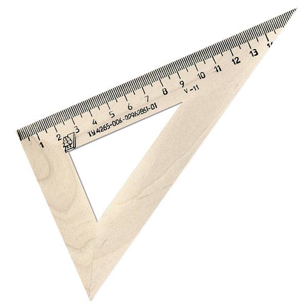 Размер треугольника: длина шкалы - 160 мм, угол - 30°. Угольник с прямым углом - 30° и 60°, изготовлен из твердолиственных пород древесины, имеют износостойкую одностороннюю шкалу.