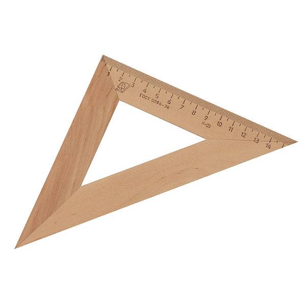 Размер треугольника: длина - шкалы 160 мм, угол - 45°. Равнобедренный угольник с прямым углом изготовлен из твердолиственных пород древесины, имеют износостойкую одностороннюю шкалу.