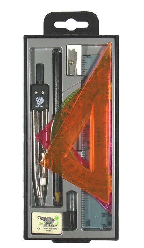| Комплектация: | циркуль, грифель, чернографитный карандаш, точилка, ластик, треугольник 30°, треугольник 45°, транспортир, линейка 15 см |