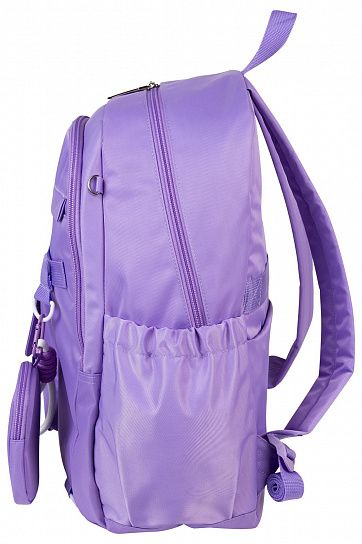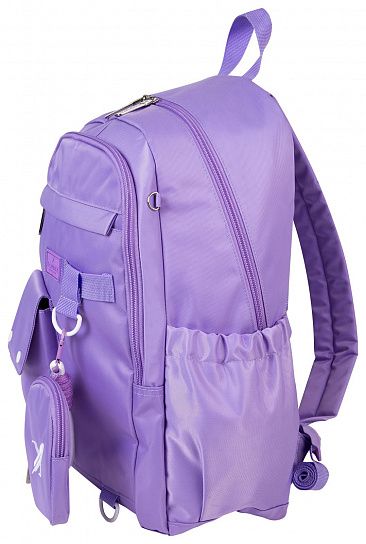 Водоотталкивающая ткань защищает от загрязнений и влаги. Накладные карманы являются не только украшением рюкзака, но и вмещают массу вещей, а декоративная стропа позволит закрепить на рюкзак фонарик или брелок. Так же имеется маленький стильный кошелек на карабине, в котором можно носить мелочи и декоративный узел, к которому можно прикрепить ключи . На спине имеется специальный «антивандальный» карман, боковые карманы уместят бутылку с водой и все необходимые мелочи, а фронтальные карманы очень удобны для хранения пропусков, карт или ключей от дома. Внутреннее пространство разделено плотным делителем для планшета или ноутбука.