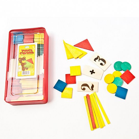Набор состоит: из счётных палочек — 20 штук, кругов — 30 штук, квадратов — 30 штук, равносторонних треугольников — 10 штук, треугольников с прямым углом и углами 30° и 60° — 10 штук, пластин с математическими знаками + - = > <