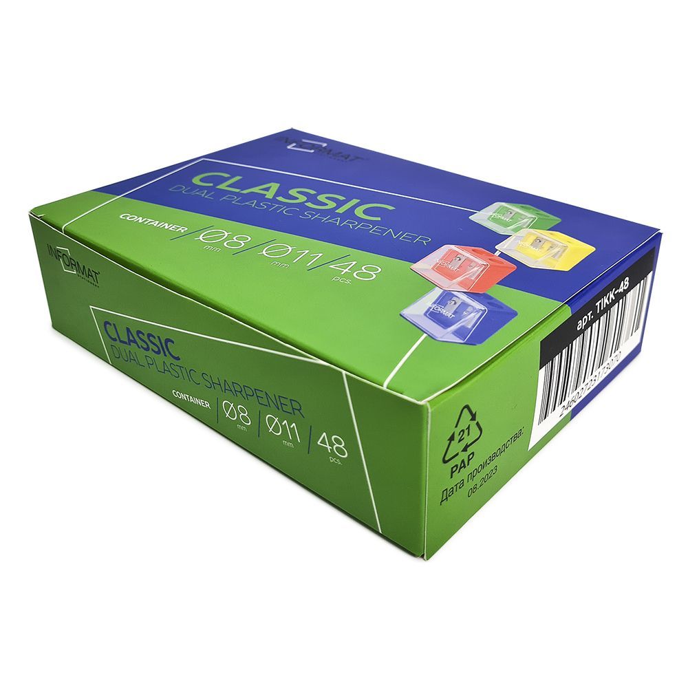 Цвет: ассорти Упаковка: дисплей Комплектация: с контейнером Наличие индивидуального штрих-кода: Да Форма: квадратная Количество отверстий для заточки: 2 отверстия Мин. партия и варианты упаковок: 1 / 48 / 1440 Точилка INFORMAT CLASSIC с контейнером, ассорти, корпус пластик, 2 отверстия, в дисплее