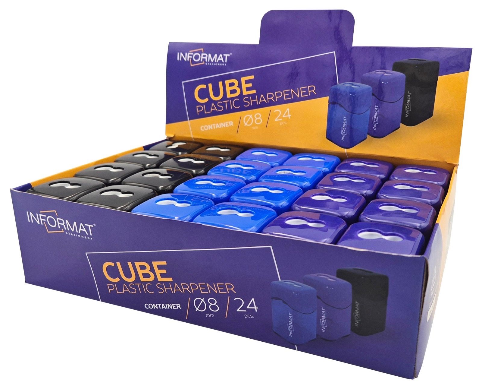 Цвет: ассорти Упаковка: дисплей Комплектация: с контейнером Наличие индивидуального штрих-кода: Да Количество отверстий для заточки: 2 отверстия Серия: OFFICE CUBE Мин. партия и варианты упаковок: 1 / 24 / 720 -